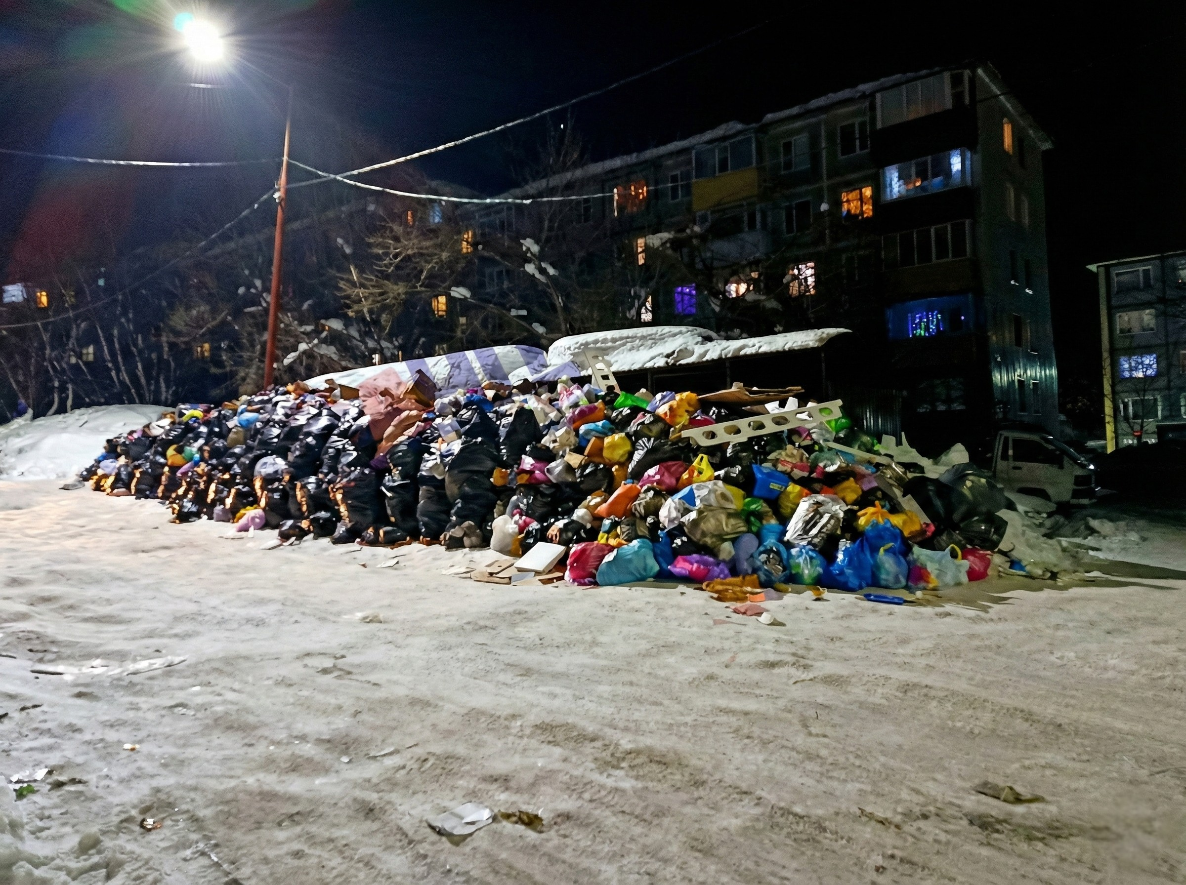 Горожане складируют отходы прямо у подъездов, которые больше напоминают лазы в пещеры. Но главная угроза впереди. Снег, перемешанный с реагентами, песком, бытовым мусором и тысячами тонн отходов жизнедеятельности, сейчас заморожен. Как только придет весна, этот токсичный коктейль потечет в реки и океан. Экологи уже прогнозируют локальную катастрофу, но властям сейчас не до этого — им бы дороги расчистить к маю.