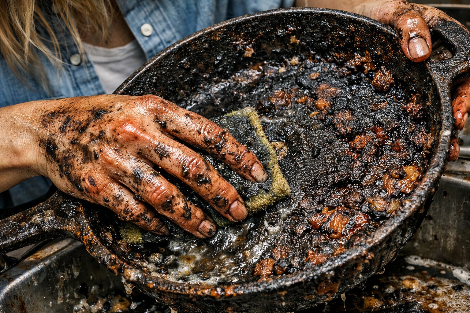 - Нагар. Многие считают его «защитной пленкой». На самом деле это спекшийся слой старого жира и грязи. При нагреве этот слой начинает выделять те же самые канцерогены, что и пережаренное масло. Вы добавляете яд в свежую еду.