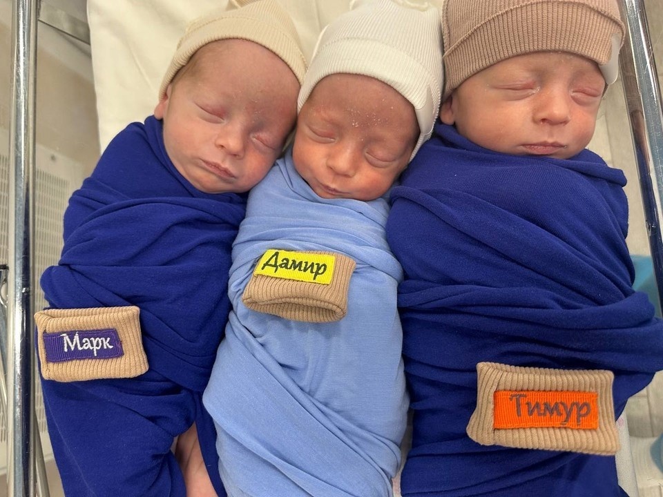 Детишки родились семимесячными, каждый весил прилично для тройняшек: 1900 г, 1850 г и 1550 г соответственно. Как и положено детям из одной яйцеклетки, мальчишки оказались одинаковыми внешне и имеют совершенно одинаковый генетический код.
