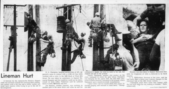 Однако вскоре на его глазах развернулась настоящая драма. Перед его отъездом в редакцию в городе пропало электричество. Линии электропередач не выдержали нагрузки от работающих вентиляторов и кондиционеров и просто отключились. Для ликвидации аварии приехали электрики Рэндалл Чемпион и его напарник Джей Томпсон.