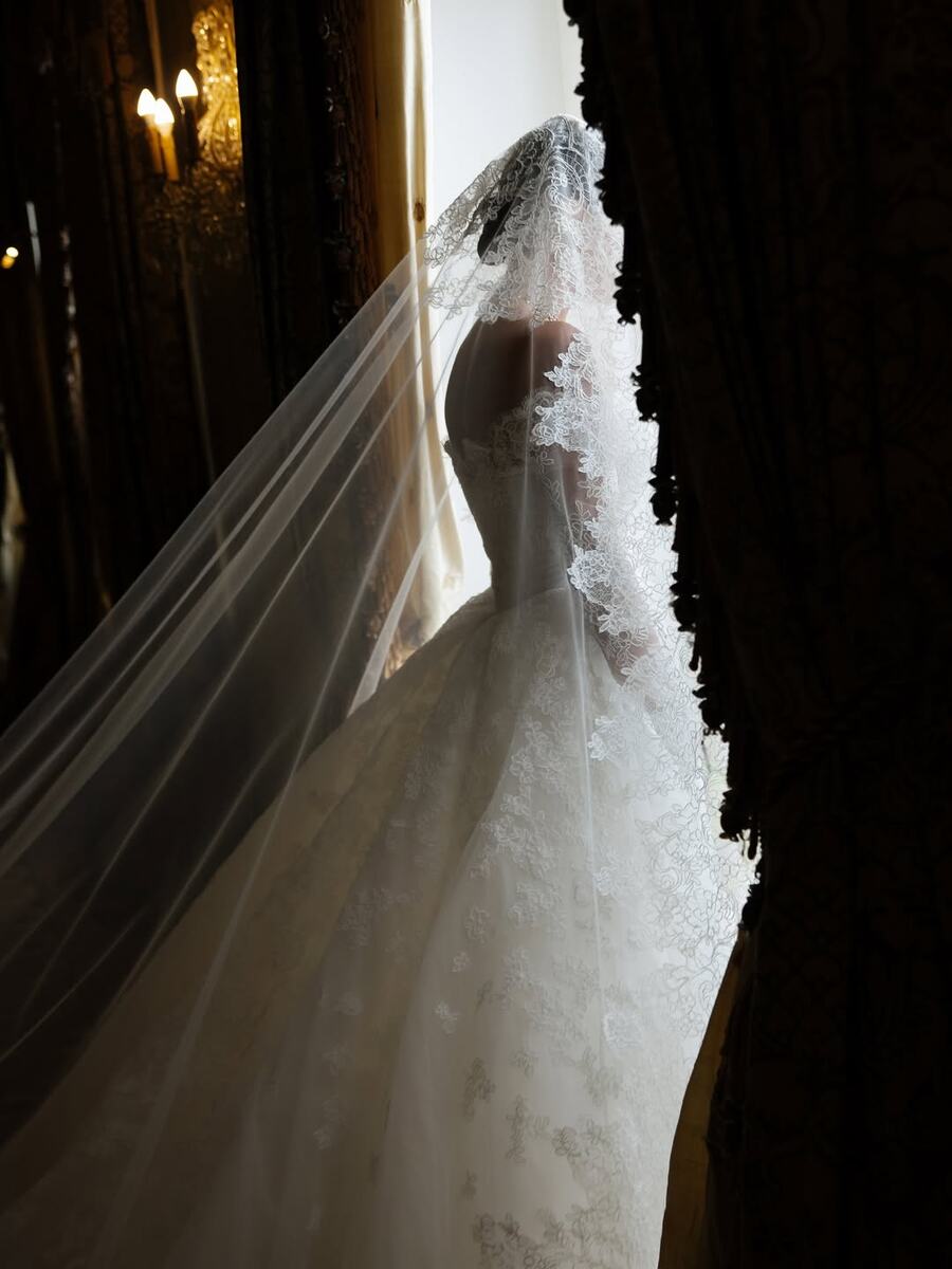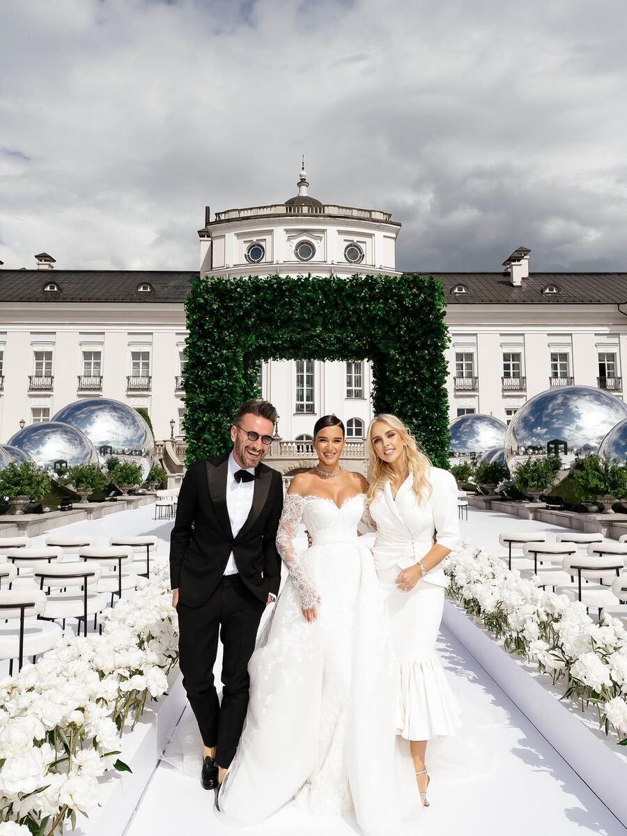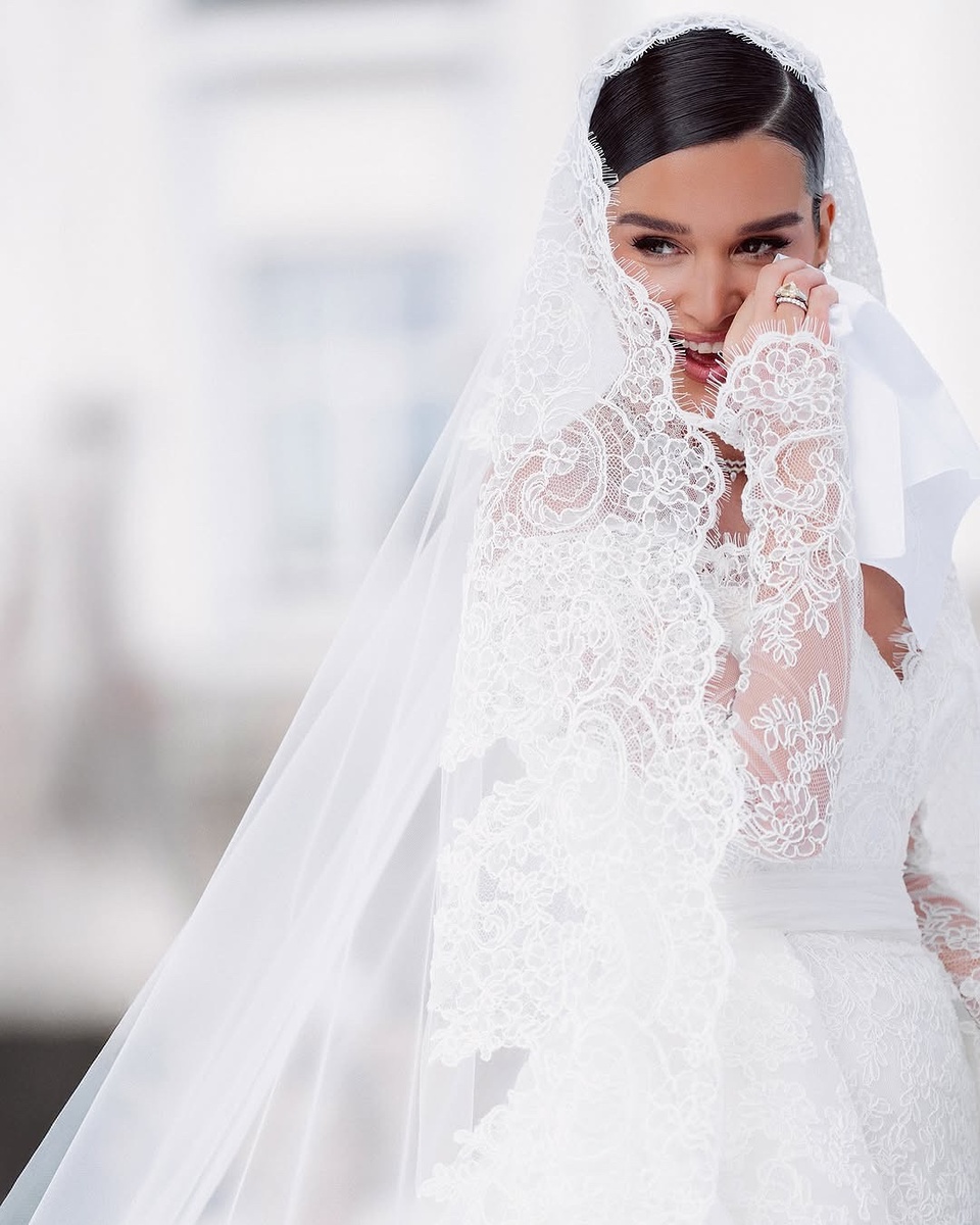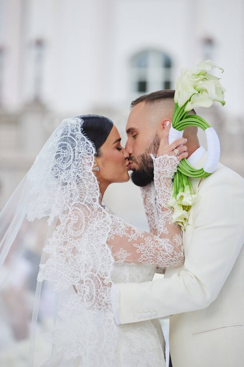 Главная героиня вечера, Ксения, для которой это стал третий брак, буквально блистала в своих трех свадебных нарядах. Сначала она предстала перед гостями в элегантном белом платье с открытыми плечами и деликатной кружевной отделкой, которое дополняла длинная, воздушная фата, изящное колье и нежный букет из белоснежных калл.