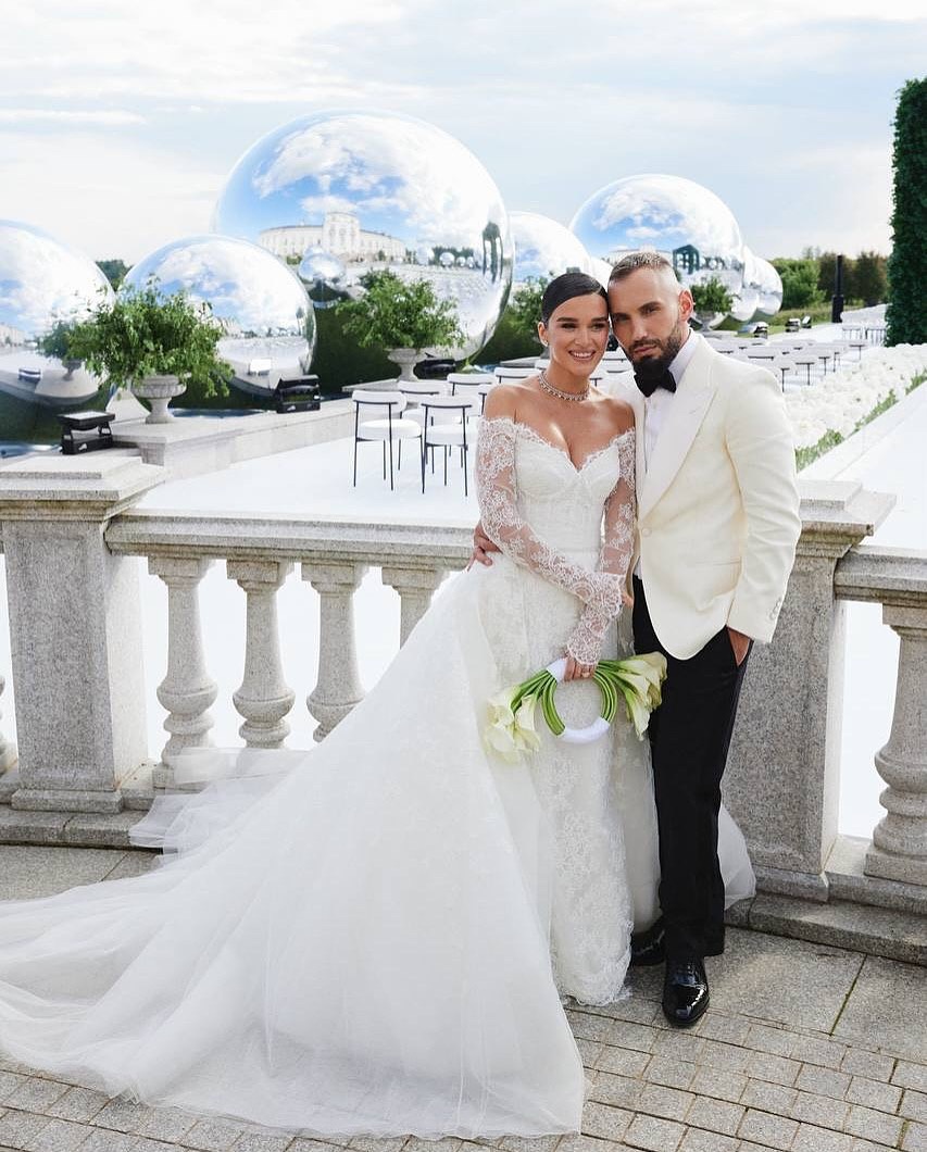 В течение вечера невеста продемонстрировала еще два других, не менее эффектных платья. Жених, Николай, выглядел безупречно, выбрав для церемонии классический белоснежный смокинг, который позже сменил на черный.