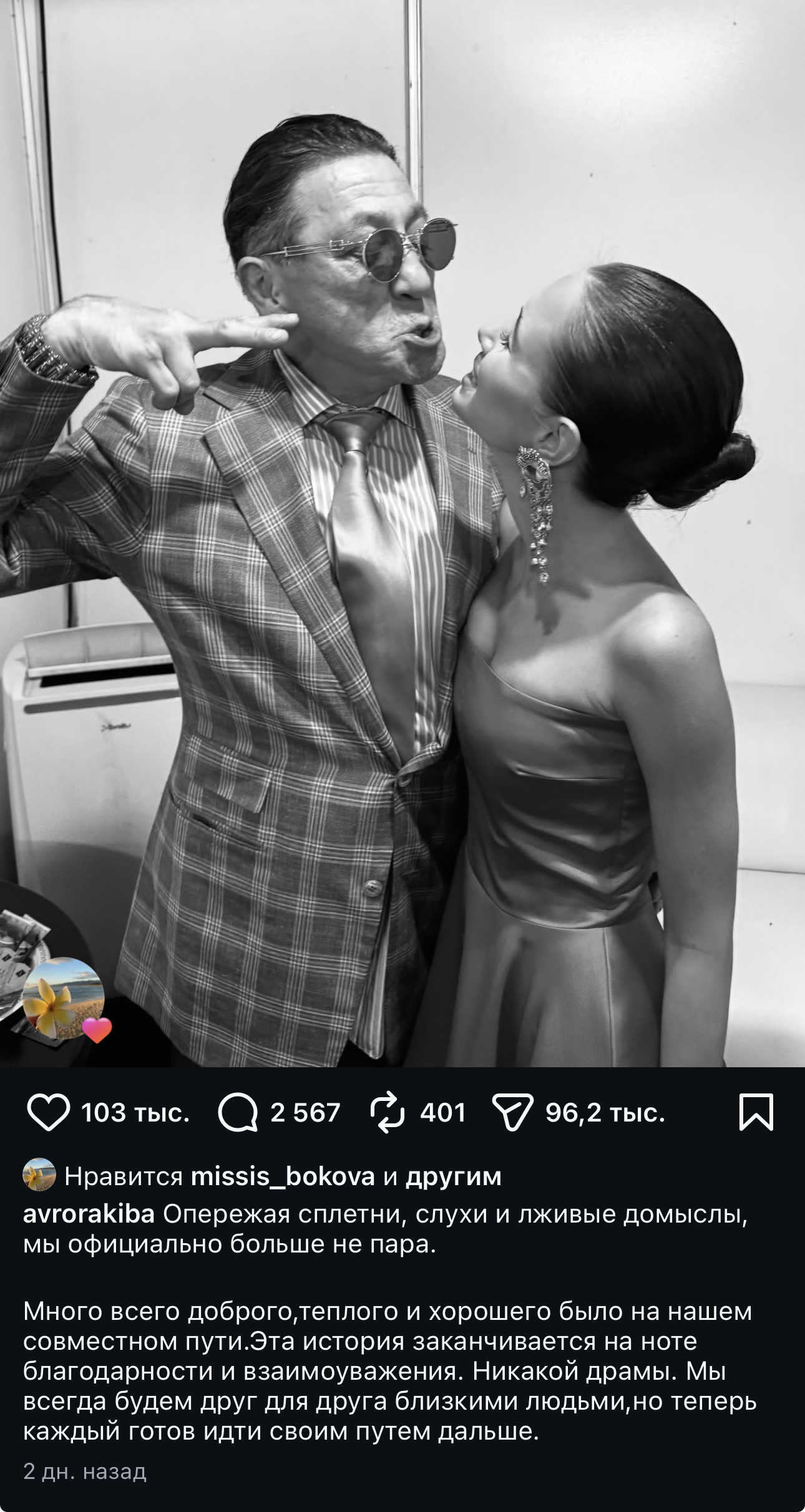 Реакция последовала незамедлительно. Спустя считанные минуты после утечки компромата, Аврора сыграла на опережение. В её личном блоге появилось черно-белое фото — эстетичное прощание с эпохой, которая длилась полтора года. На снимке они все еще смотрят друг другу в глаза, но текст под ним ставит жирную точку в истории неравного брака.