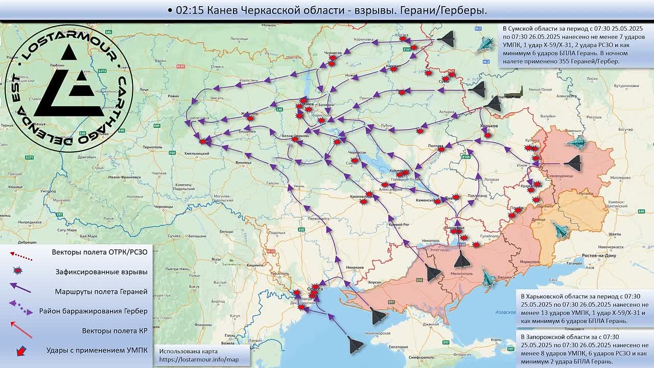 В ответ Россия нанесла комбинированный удар по объектам на территории Украины. По данным Минобороны РФ, были использованы около 69 крылатых и баллистических ракет, а также почти 300 ударных дронов типа «Герань-2». Удары пришлись на Киевскую, Харьковскую, Одесскую, Сумскую и другие области. Эксперты подчёркивают, что такой объём применения средств поражения может быть частью более масштабной стратегии.