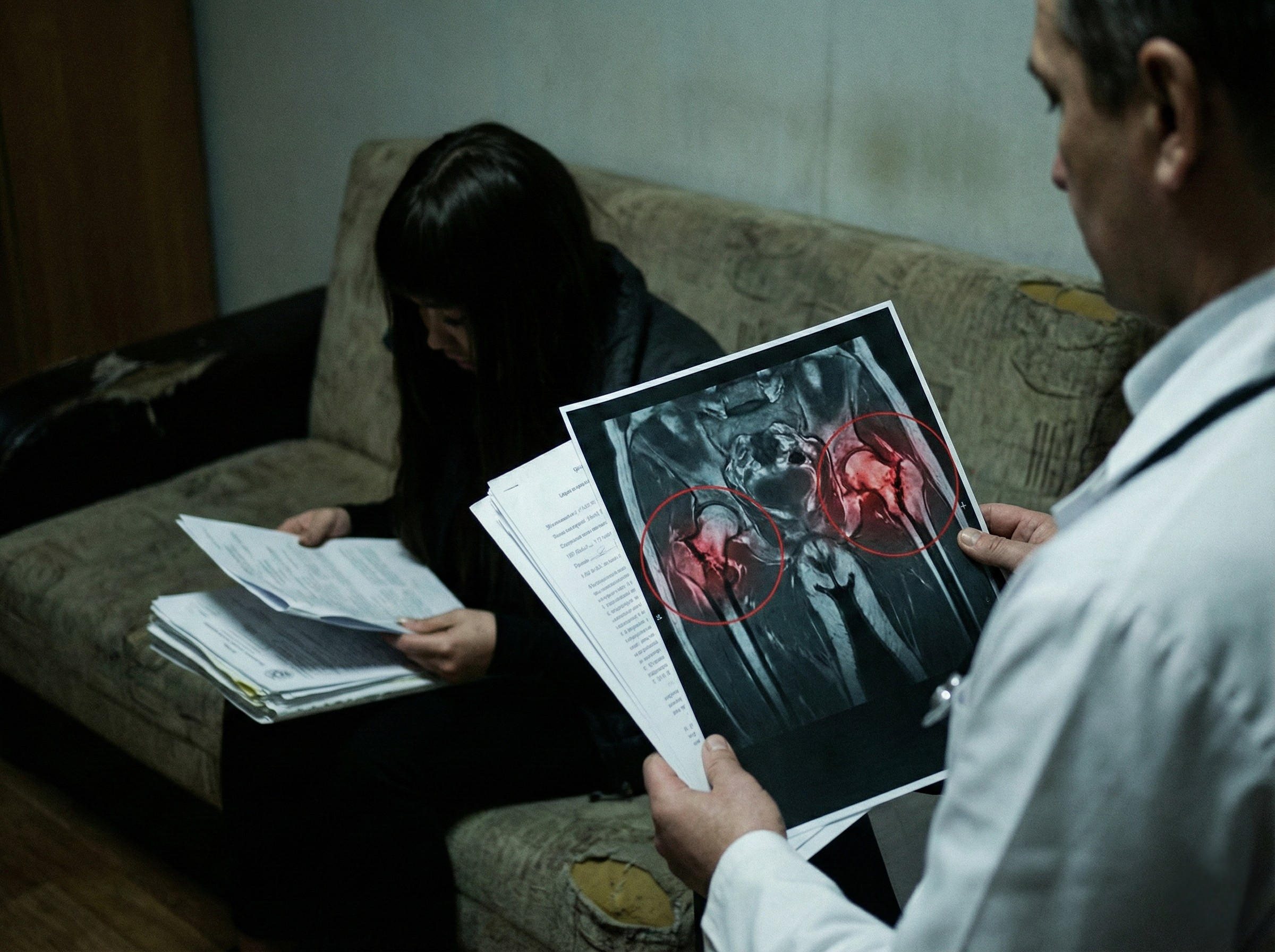 Ткани, лишенные кровоснабжения, начали отмирать. Но самое страшное скрывалось глубже. Диагноз врачей звучит как приговор: некроз тканей и инфаркт тазобедренной кости. Бедро разрушается изнутри, и теперь речь идет не об эстетике, а о реальной перспективе ампутации ног, если медикаментозное лечение окажется бессильным.