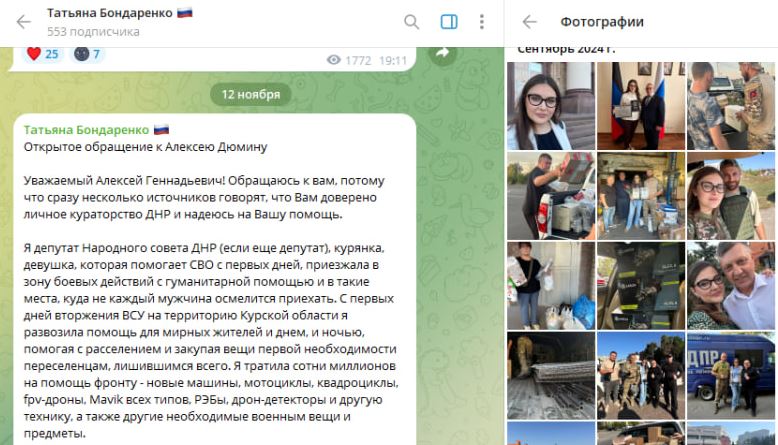 Меж тем в личном телеграм-канале донецкого депутата не так давно появилось ее обращение в адрес Алексея Дюмина, секретаря Госсовета, члена Совета безопасности, Героя России. Бондаренко обратилась к нему как к политику, курирующему вопросы, связанные с ДНР.