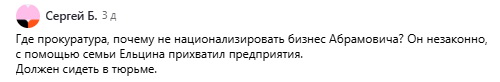 Сергей Б.: «Где прокуратура, почему не национализировать бизнес Абрамовича? Он незаконно, с помощью семьи Ельцина прихватил предприятия. Должен сидеть в тюрьме».