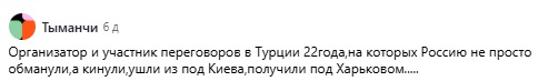 Тыманчи: «Организатор и участник переговоров в Турции 22года,на которых Россию не просто обманули,а кинули,ушли из под Киева,получили под Харьковом.....».