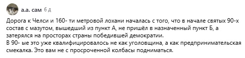 а.а. сам: «Дорога к Челси и 160- ти метровой лохани началась с того, что в начале святых 90-х состав с мазутом, вышедший из пункт А, не пришёл в назначенный пункт Б, а затерялся на просторах страны победившей демократии. В 90- ые это уже квалифицировалось не как уголовщина, а как предпринимательская смекалка. Это вам не с просроченной колбасы подниматься».