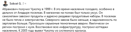 Sokrat G.: «Абрамович получил Чукотку в 1999 г. В это время население голодало, особенно в дальних от Анадыря поселках. В магазинах на полках был только уксус. Он самолетами завозил продукты и адресно раздавал продуктовые наборы. В поселках не было тепла и электричества. Северного завоза было меньше, а задолженность по зарплатам больше. Произошли серьезные техногенные аварии. Фактически он регион построил с нуля. Восстановил всю инфраструктуру, построил коттеджи населению, К 2005 году вывел Чукотку из системного кризиса».