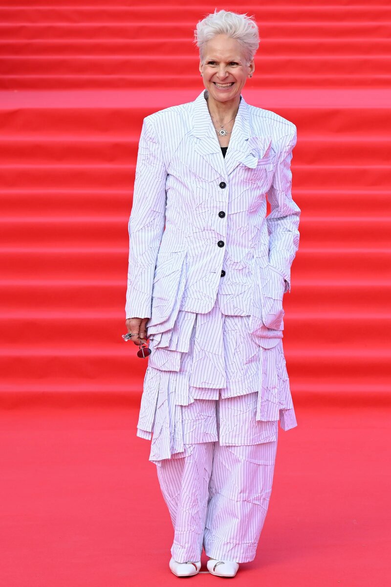 На красной дорожке Артемьева появилась в образе платиновой блондинки. Короткая объёмная стрижка с выбритыми висками была дополнена белым костюмом в серую полоску.