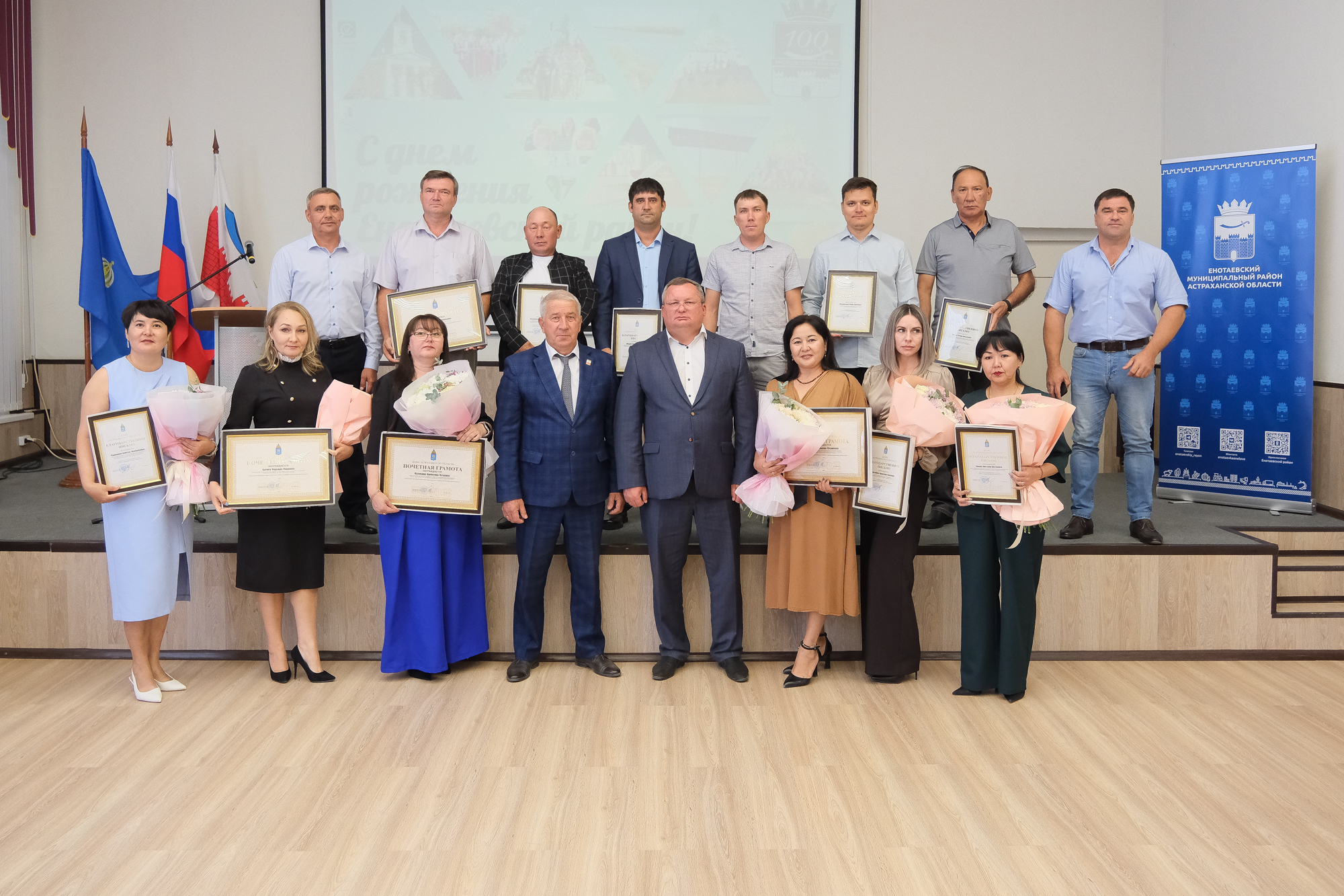 После в актовом зале районной администрации прошло торжественное собрание в честь юбилея образования Енотаевского района. Игорь Мартынов поздравил жителей и отметил значимость труда каждого на благо района. Также он вручил почетные грамоты и благодарственные письма Думы отличившимся сотрудникам учреждений культуры и образования, сельхозпредприятий, депутатам и предпринимателям.
