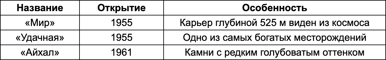 Михаил Ломоносов предположил наличие драгоценных камней в Сибири еще в XVIII веке, однако активная геологическая разведка стала проводиться только в советское время. Поиски увенчались грандиозным успехом: в 1954 году геологи открыли первое крупное месторождение «Зарница», а затем еще несколько мест залегания алмазной руды высокого качества.