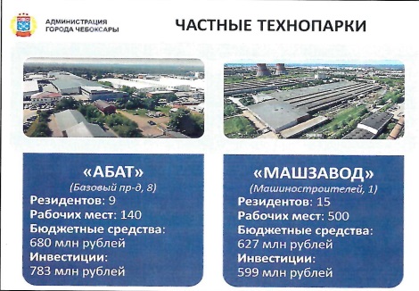 Кроме того, в рамках госпрограммы «Экономическое развитие и инновационная экономика» в Чебоксарах создают частные технопарки «Машзавод» и «Абат». Их запуск запланирован на 2024 год. Планируется, что в частных технопарках будет создано 640 рабочих мест, а выручка от производств к 2032 году превысит 20 млрд рублей.