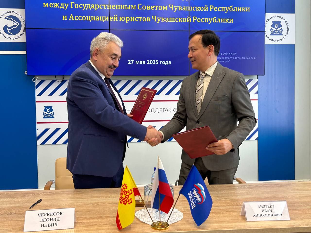 Председатель Госсовета Чувашии Леонид Черкесов и председатель правления Ассоциации юристов республики Иван Андреев подписали соглашение о сотрудничестве.