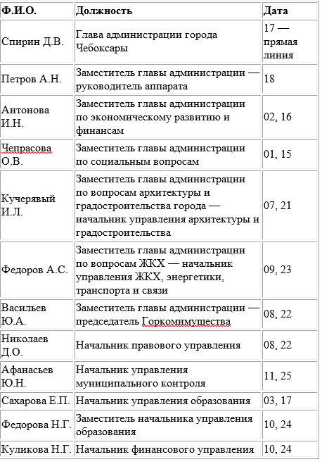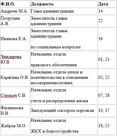 Время приема: главой и заместителями главы: в рабочие дни с 14.00 до 16.00 (по предварительной записи), начальниками отделов — с 14.00 до 16.00 (без записи).