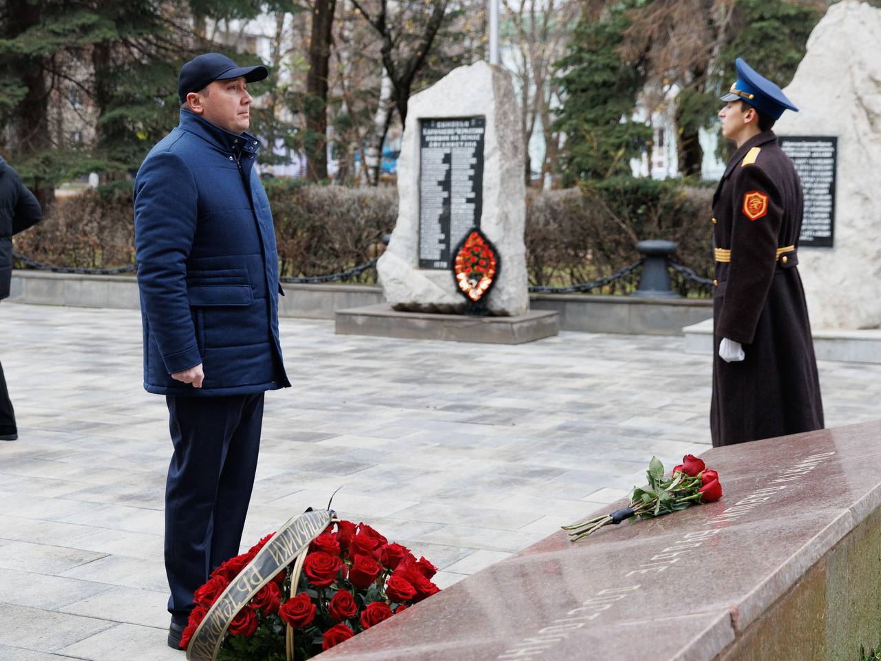 Карачаево-ЧеркесияГлава КЧР Рашид Темрезов и мэр Черкесска Алексей Баскаев в День Героев Отечества возложили цветы к бюсту Героя России Канамата Боташева