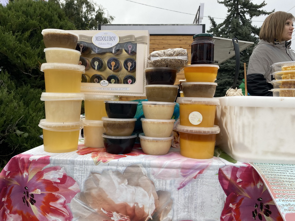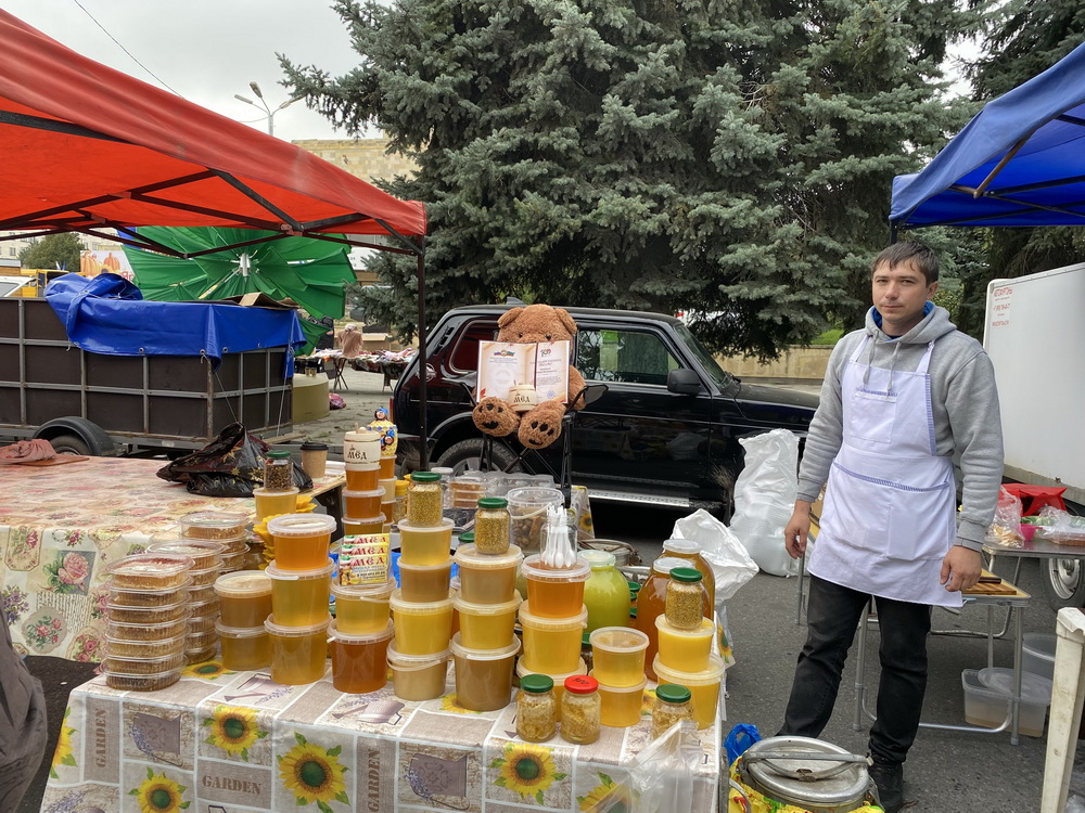 «У меня четыре сорта мёда: акация с боярышником, кориандр, разнотравье цветочное, также местное горное разнотравье. Есть и пыльца, перга, прополис, воск, сотовый мёд», - рассказал один из продавцов Андрей Братков.