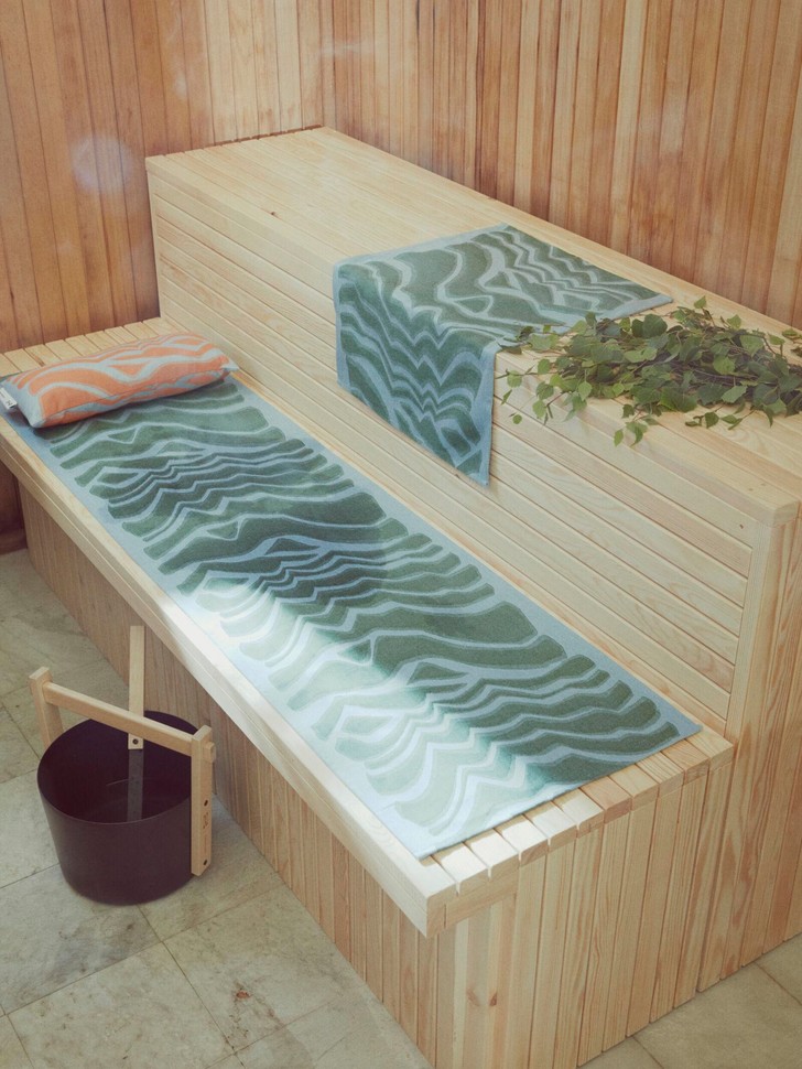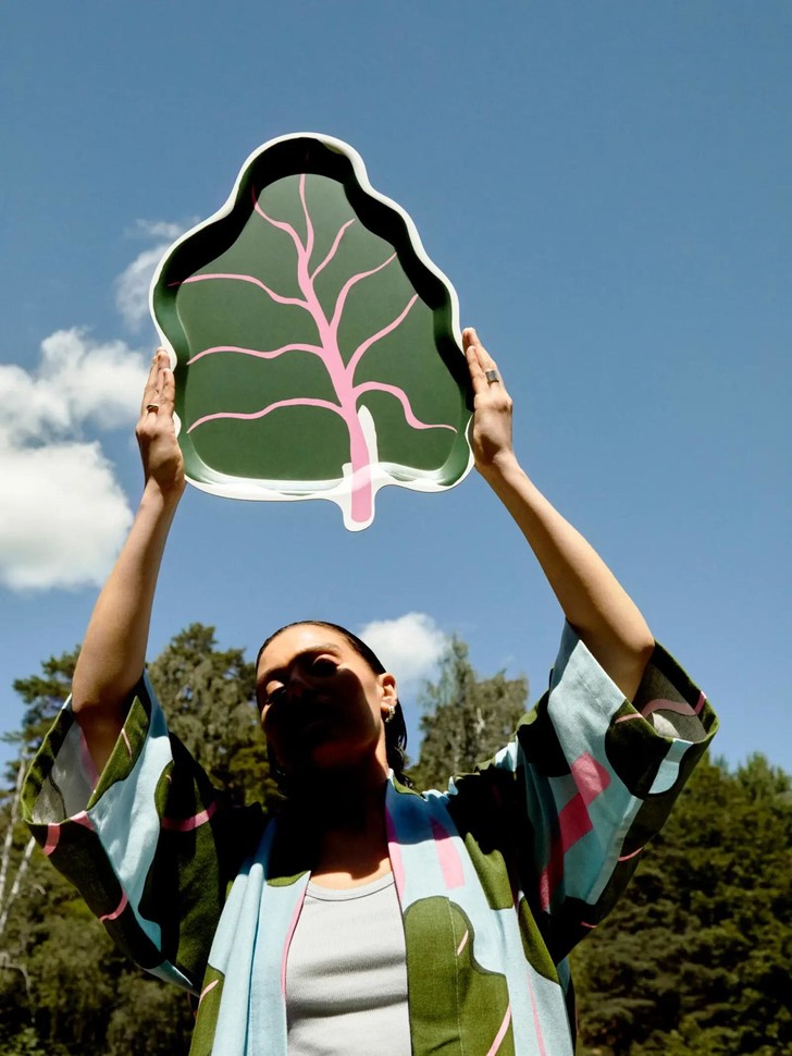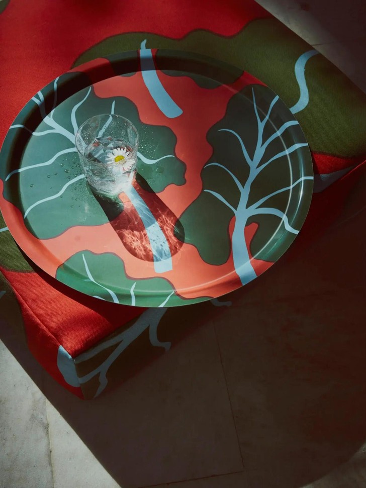 В коллекцию вошли табуреты, подносы, столики, посуда, полотенца и лежаки, занавески для ванной, домашний текстиль.