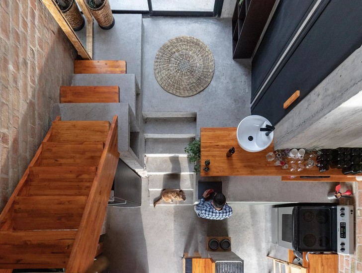 Свод дома укреплён слоем бетона толщиной три сантиметра. Внутри пространство делится на три уровня. Внизу расположены столовая, кухня и гостиная, чуть выше – вход в дом и ванная, а ещё выше – спальня и студия в открытом мезонине.