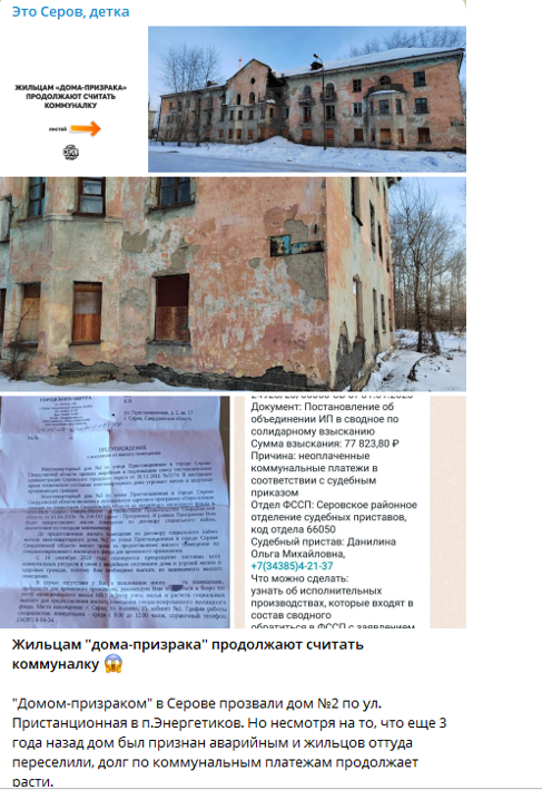 О взыскании средств за коммунальные услуги с жителей аварийных домов ранее сообщали уральские СМИ. По данным URA.ru, на неправомерные взыскания пожаловался в Telegram житель поселка Энергетиков в городе Серове.