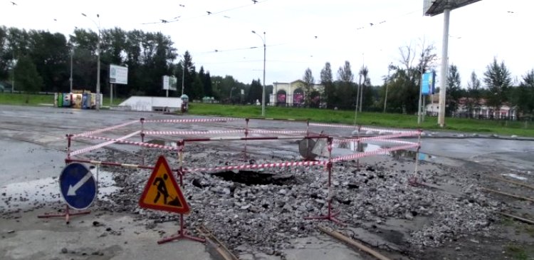 Трубопровод расположен прямо под трамвайными путями возле ЦПКиО. Чтобы устранить аварию, необходимо временно демонтировать часть рельсов. В указанном месте транспорт не будет ходить до вечера.