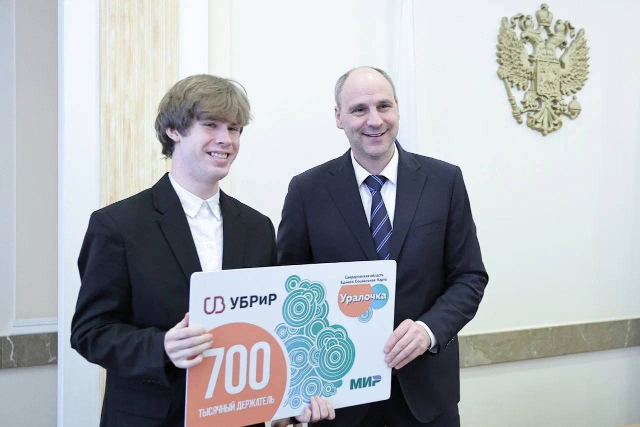 «Проект набирает обороты. Мы вручили юбилейную 700-тысячную карту «Уралочка». Её обладателем стал студент УрГЭУ Иван Леганьков», - отметила председатель Законодательного Собрания Свердловской области Людмила Бабушкина.