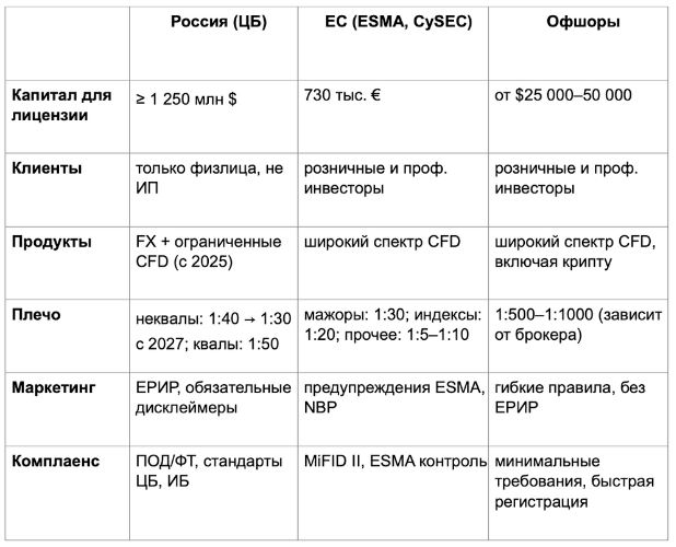 В России дорого и сложно соответствовать требованиям: нужен капитал от 1 250 млн $, членство в СРО, строгий комплаенс. В офшорах барьеры ниже, а условия гибче — широкий выбор CFD, плечи до 1:500–1:1000, меньше ограничений в маркетинге.