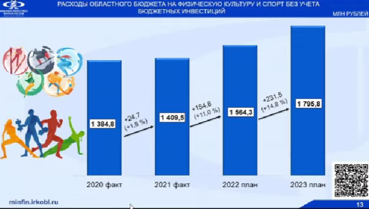 Расходы на поддержку физической культуры и спорта в 2023 году будут увеличены почти на 15% и составят 1,8 млрд рублей. Так, большую статью расходов составит создание «умных спортивных площадок», на оснащение которых в течение 2024-2025 годов будет выделено почти 140 млн рублей.
