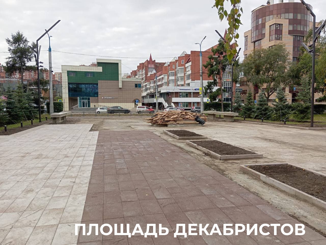 На площади Декабристов высажены ели, ведётся укладка плитки и оформление клумб.