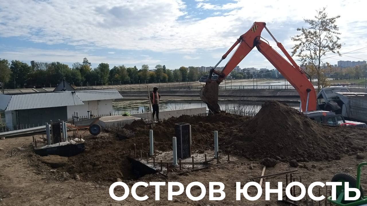 На острове Юность завершена обратная засыпка суглинком, установлена опалубка под монолитную плиту перекрытия палубы, продолжается армирование конструкции, а также монтаж металлического каркаса открытой площадки.