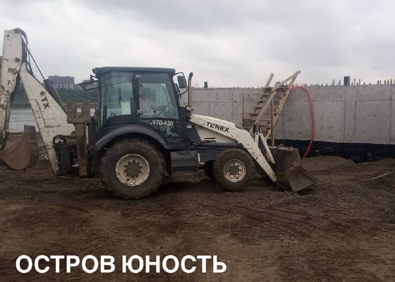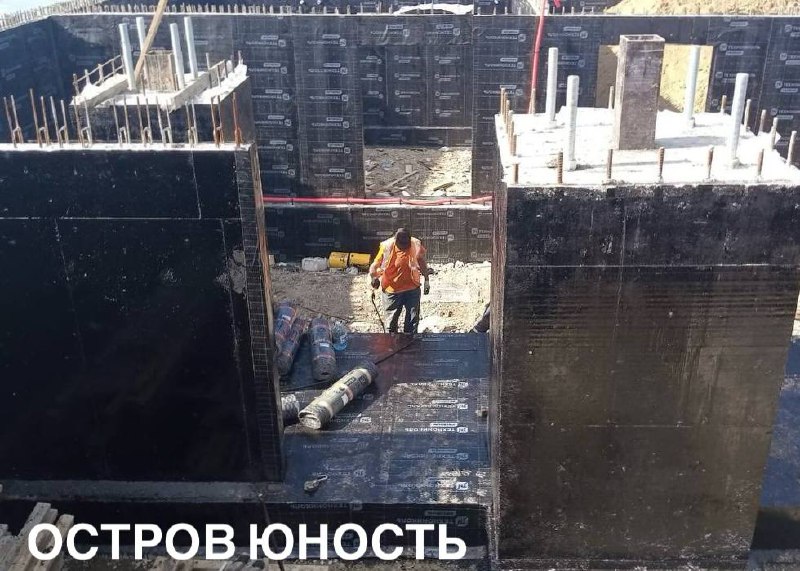 На северной части острова Юность ведутся работы по разработке траншеи для кабеля наружного освещения, гидроизоляции подпорной стены и ростверка. Также начато изготовление каркаса лестницы.