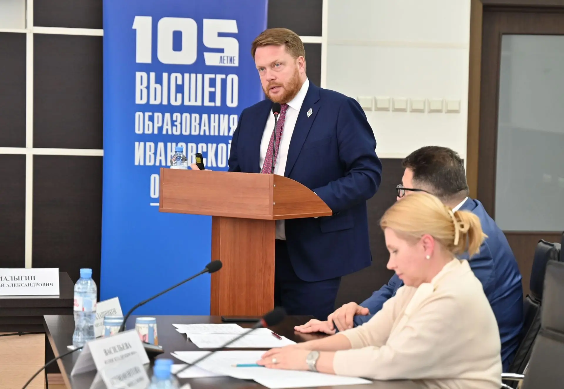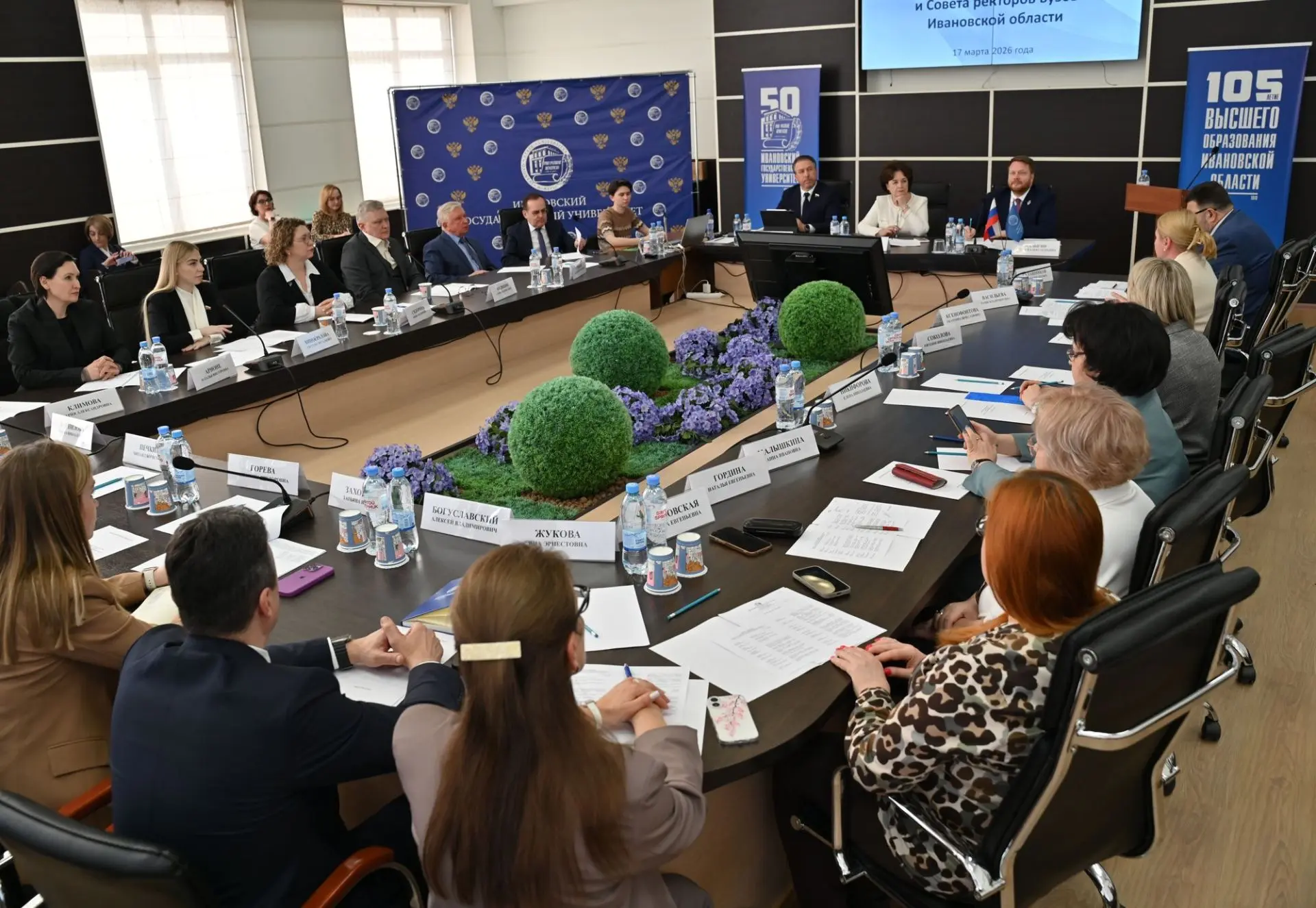 В Ивановском государственном университете прошло совместное заседание комиссии Ивановской областной Думы по малым городам и Совета ректоров вузов региона. В мероприятии приняли участие председатель Ивановской областной Думы Марина Дмитриева, заместитель председателя правительства области Юлия Васильева, главный федеральный инспектор по региону Михаил Калашников. Дискуссию модерировал председатель профильной комиссии Александр Гусаковский.