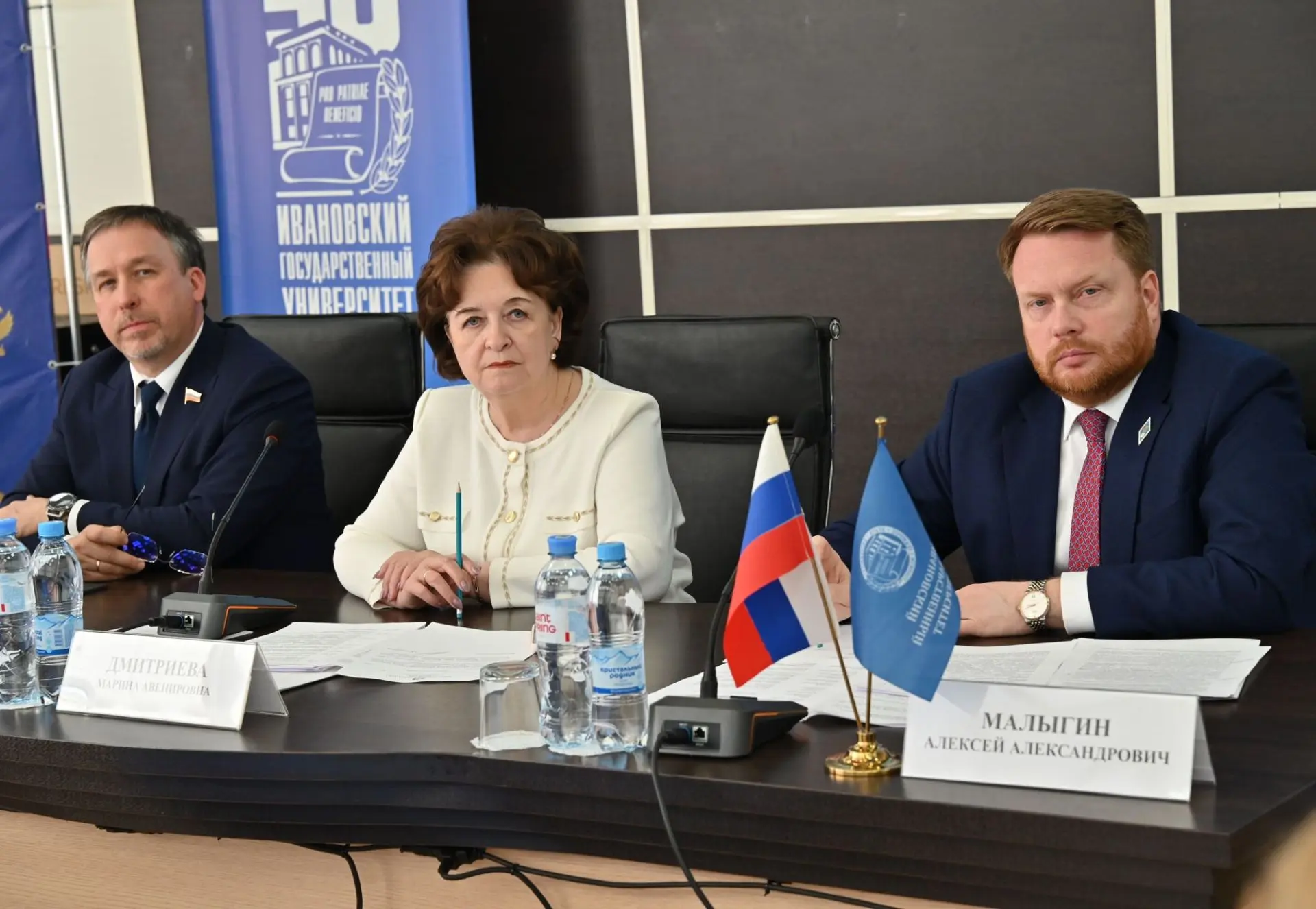 В Ивановском государственном университете прошло совместное заседание комиссии Ивановской областной Думы по малым городам и Совета ректоров вузов региона. В мероприятии приняли участие председатель Ивановской областной Думы Марина Дмитриева, заместитель председателя правительства области Юлия Васильева, главный федеральный инспектор по региону Михаил Калашников. Дискуссию модерировал председатель профильной комиссии Александр Гусаковский.