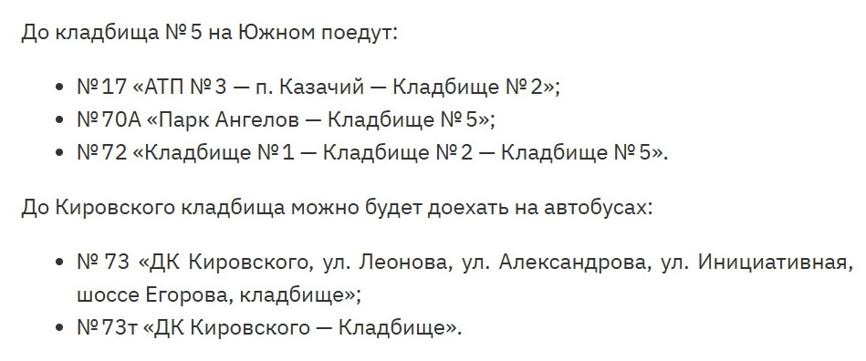 В пресс-службе горадминистрации проинформировали, что работа пассажирского транспорта будет проходить по расписанию буднего дня, но с организаций автобусов до кладбищ с 09:00 до 18:00, в жилые районы Кедровка, Ягуновский, а также в посёлок Боровой до 16:00.