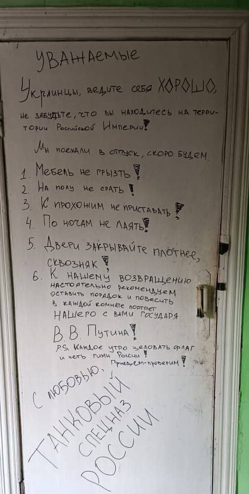 Инструкция, написанная на двери, содержит шесть пунктов, требующих «вести себя хорошо». В частности, бойцам ВСУ советуют не гадить, не грызть мебель, не лаять по ночам и не приставать к прохожим, потому что скоро спецназ «вернется из отпуска и проверит поведение».