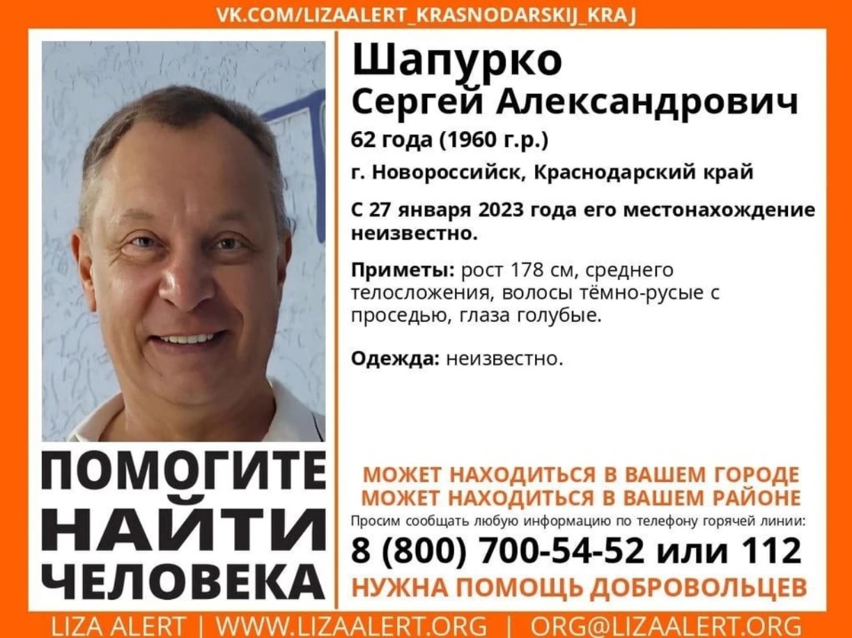 «Живая Кубань» пишет, что в Шапурко пропал в Новороссийске. Мужчине 62 года.