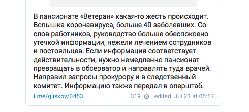 Ранее через Telegram-канал сотрудница пансионата обратилась к общественности с жалобой. Женщина рассказала, что заразилась коронавирусной инфекцией на работе. Руководство, по ее словам, замалчивало факт угрозы заражения и не предприняло необходимых действий. Ни сотрудники, ни пожилые постояльцы пансионата не были обеспечены СИЗами, антисептиками, не были приняты меры по ограждению потенциально зараженных людей.