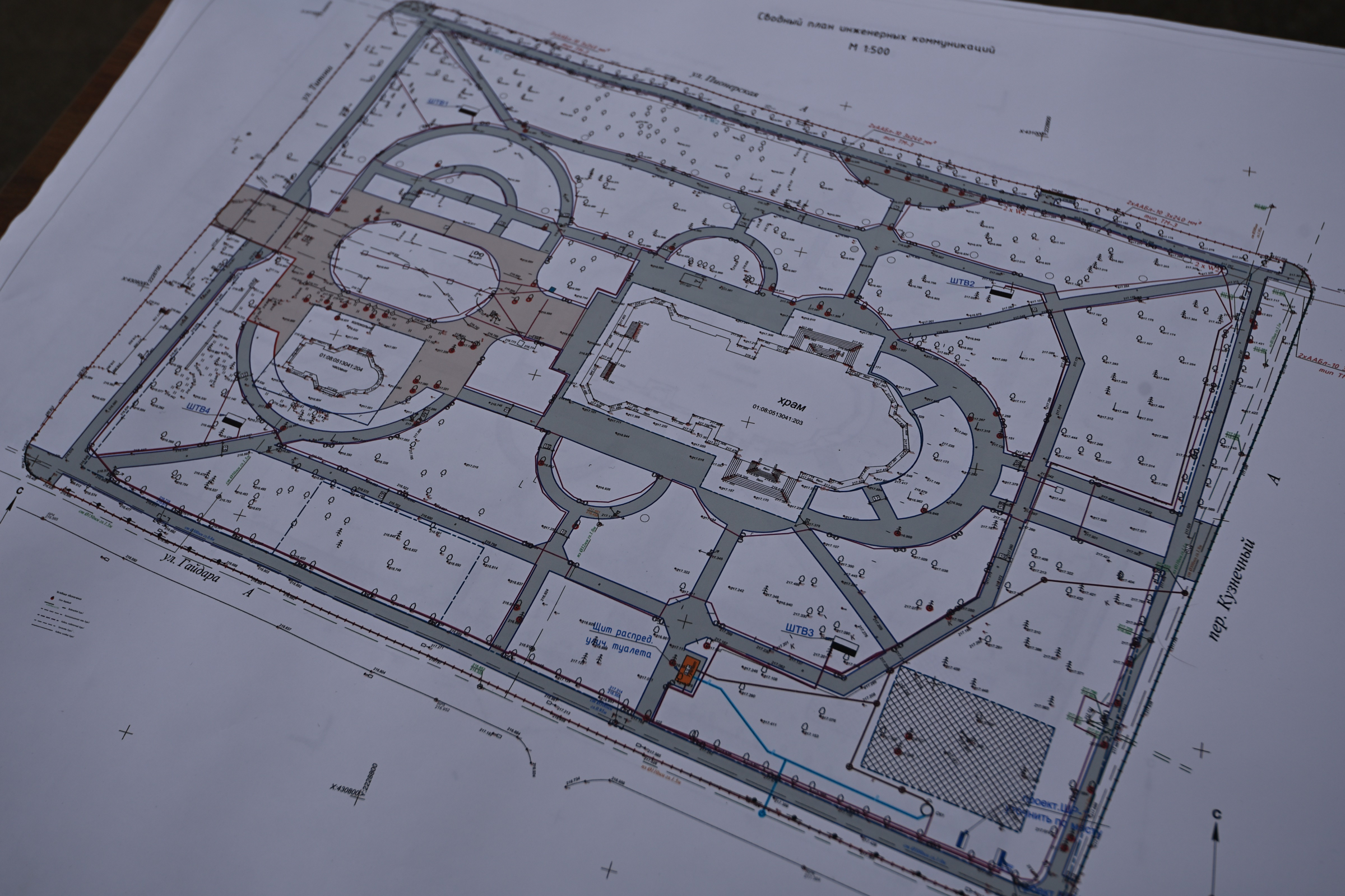 На текущем этапе проводится обследование зеленых насаждений и расчистка территории, уже демонтированы временные конструкции рядом с новым зданием собора.