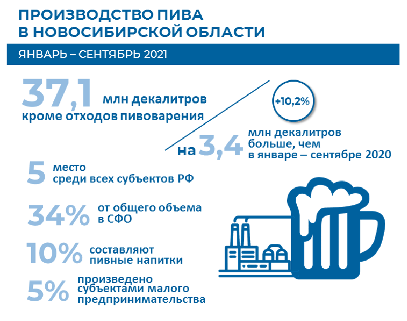«По производству пива Новосибирская область занимает пятое место среди всех субъектов Российской Федерации (после Московской области, Республики Татарстан, города Санкт-Петербурга, Ульяновской области) и первое — среди регионов Сибирского федерального округа», - сказано в пресс-релизе ведомства.
