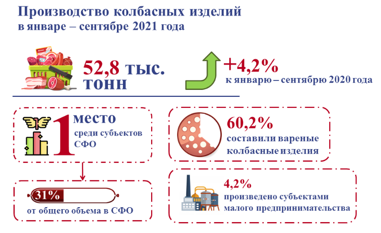«По производству колбасных изделий Новосибирская область занимает девятое место среди всех субъектов Российской Федерации и первое – среди регионов Сибирского федерального округа (31% от общего объёма по СФО)», - отмечается в пресс-релизе территориальной службы статистики.