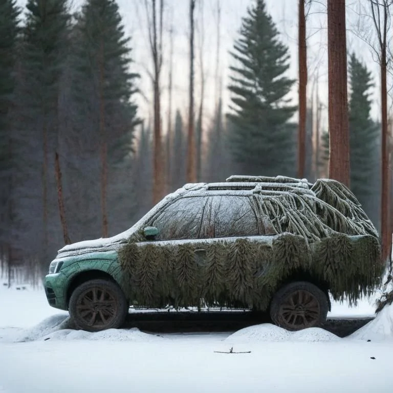 На изображении есть и автомобиль. Внедорожник увешан еловыми ветвями.