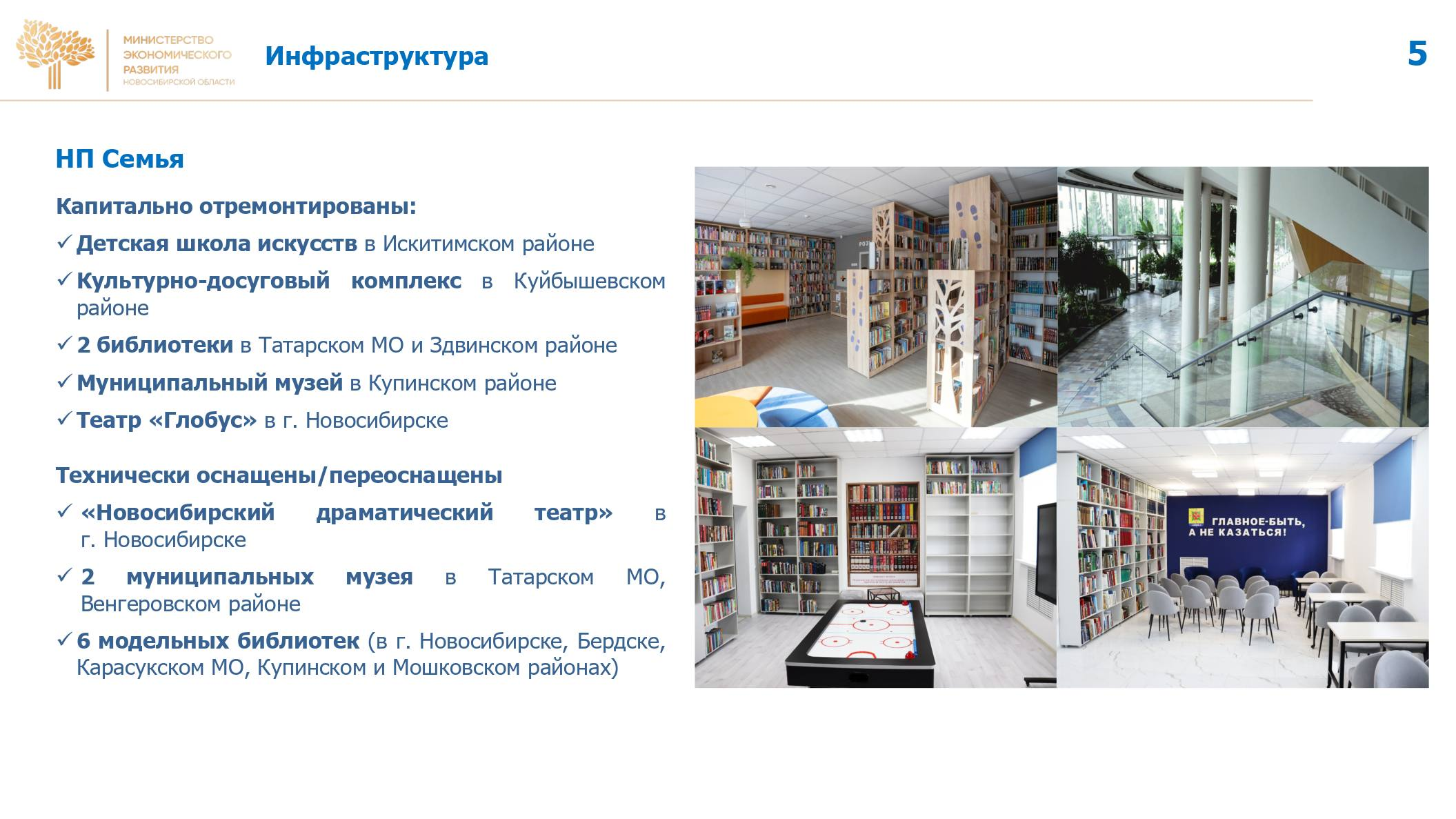 По нацпроекту «Семья» также был выполнен капитальный ремонт учреждений культуры, включая детскую школу искусств, культурно-досуговый комплекс, библиотеки, муниципальный музей и театр «Глобус» в Новосибирске. Дополнительное техническое оснащение получили два муниципальных музея в Татарском муниципальном округе, Венгеровском районе. Получили переоснащение шесть модельных библиотек в Новосибирске, Бердске, Карасукском муниципальном округе, Купинском и Мошковском районах.