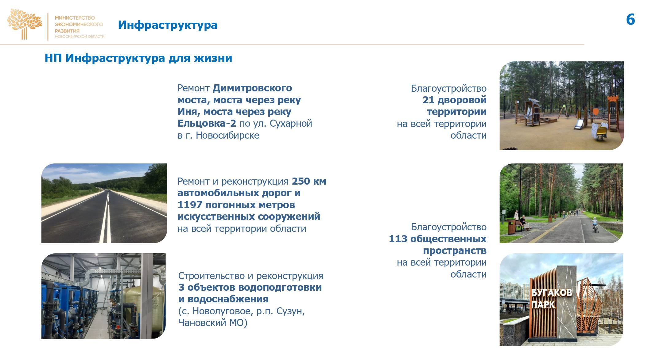 Кроме того, в рамках нацпроекта «Инфраструктура для жизни» проведен ремонт Димитровского моста в Новосибирске, а также мостов через реки Иня и Ельцовка-2 по улице Сахарной. В целом в регионе отремонтированы и реконструированы 250 км автомобильных дорог и 1 197 погонных метров искусственных сооружений. В сфере коммунальной инфраструктуры построены и модернизированы три объекта водоподготовки и водоснабжения в Новолуговом, Сузуне и Чановском муниципальном округе.