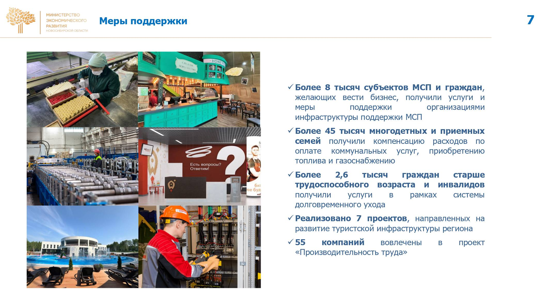Существенный блок работы был связан с мерами поддержки: услуги получили более 8 тыс. субъектов малого и среднего предпринимательства и граждан, планирующих открыть бизнес, а свыше 45 тыс. многодетных и приемных семей получили компенсации расходов на ЖКХ, топливо и газоснабжение. При этом в проект «Производительность труда» были вовлечены 55 компаний.