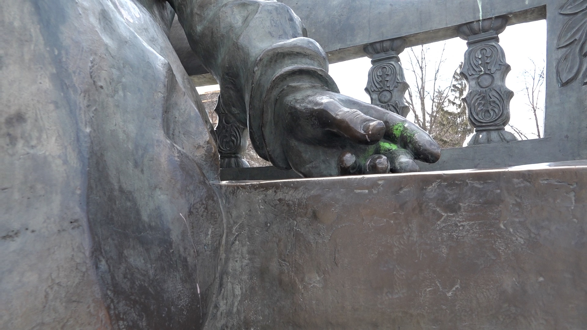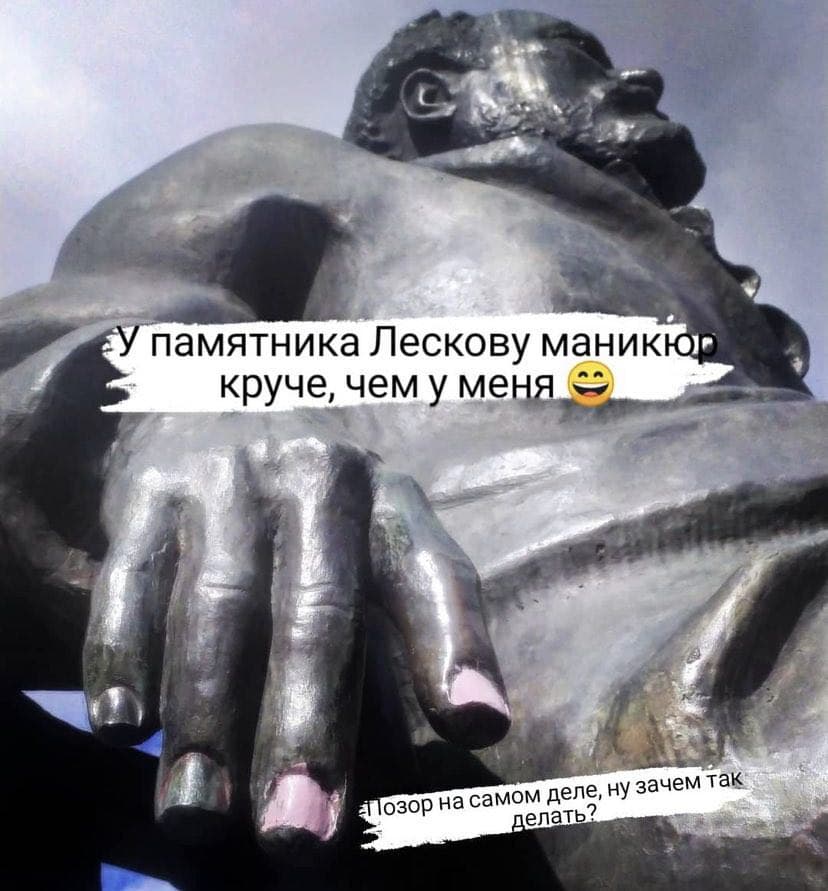 Сегодня, 16 апреля, журналист ВГТРК-Орел Юлия Сабельникова в своем аккаунте в социальной сети Instagram опубликовала фото руки памятника писателю Николаю Лескову с накрашенными ногтями. Неизвестные вандалы раскрасили скульптуру розовым лаком.