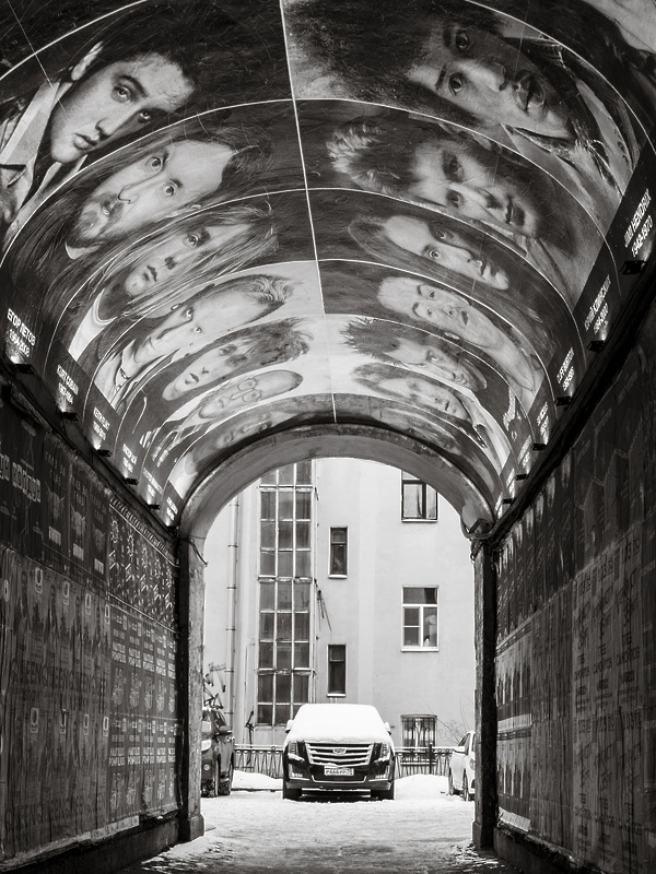 Все работы черно-белые, такой стиль помогает обратить внимание на детали, на которые обычно не обращают внимания сами жители. На одной из фотографий можно увидеть проход с изображением на потолке портретов рок-звезд. Этот проход ведет к самому старому рок-магазину в Санкт-Петербурге и в России в целом.