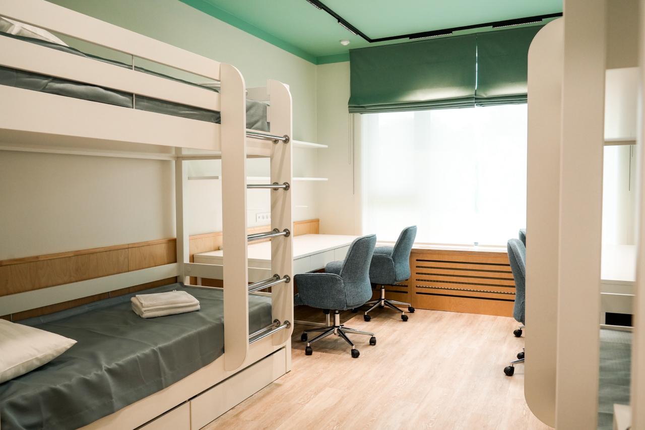 Каждый корпус оснащен жилыми комнатами, учебными зонами, пространствами для отдыха, а также медицинским блоком. Для занятий спортом и творчеством доступны бассейн, стадион и различные кружки.