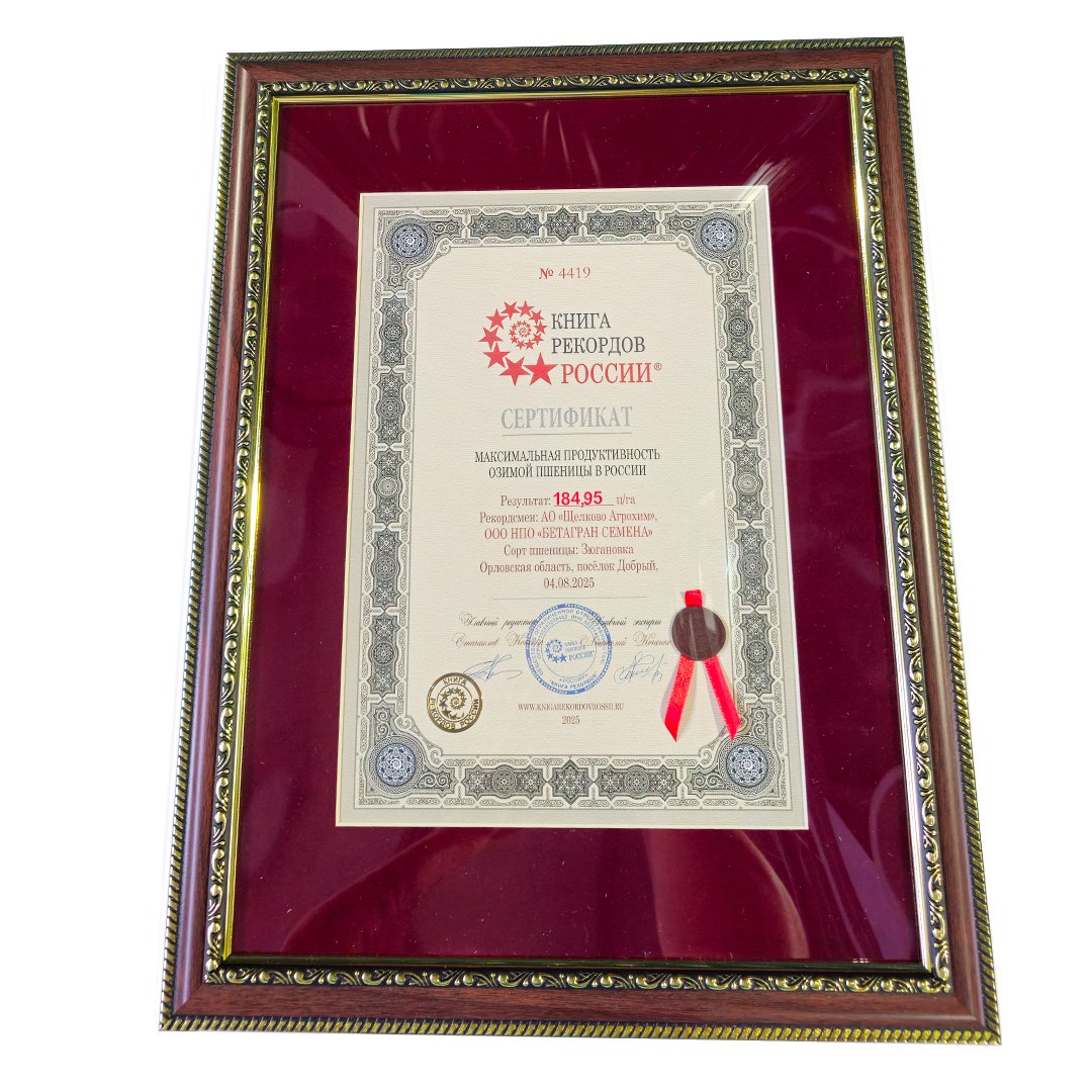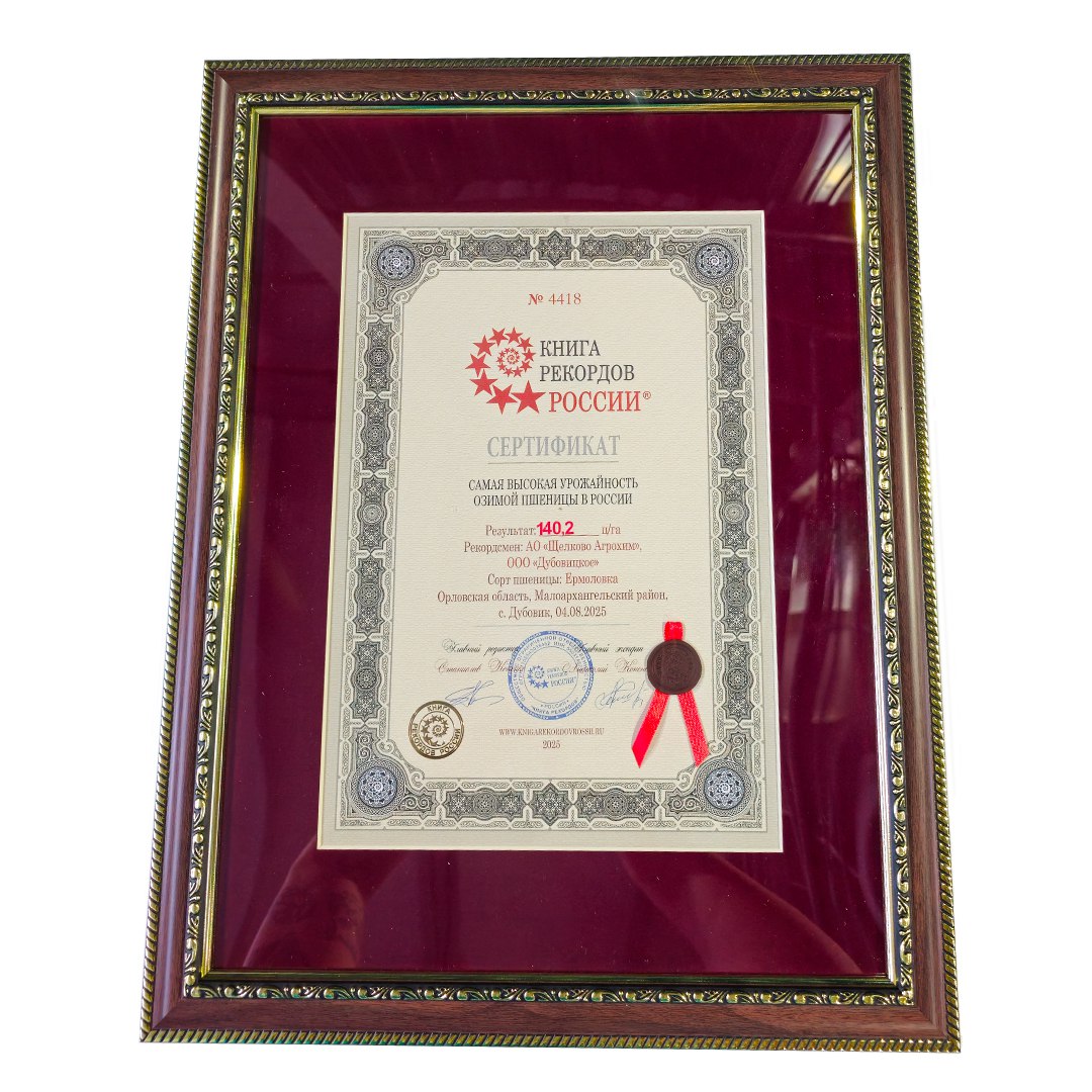 Компания «Щелково Агрохим» поделилась своими новыми достижениями: на селекционных делянках «Бетагран Семена» удалось собрать 184,95 центнера озимой пшеницы сорта «Зюгановка» с гектара, а в Орловской области на полях ООО «Дубовицкое» — 140,2 ц/га озимой пшеницы сорта «Ермоловка» — это почти в четыре раза больше средней урожайности по России (36,8 ц/га) и на 36,5 ц/га больше, чем два года назад на этих же полях.
