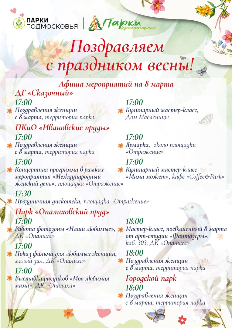 В парках г.о. Красногорск с 17:00 8 марта начнут праздновать Международный женский день. Праздничные мероприятия пройдут в ДГ «Сказочный», ПКиО «Ивановские пруды», парке «Опалиховский пруд» и Городском парке.